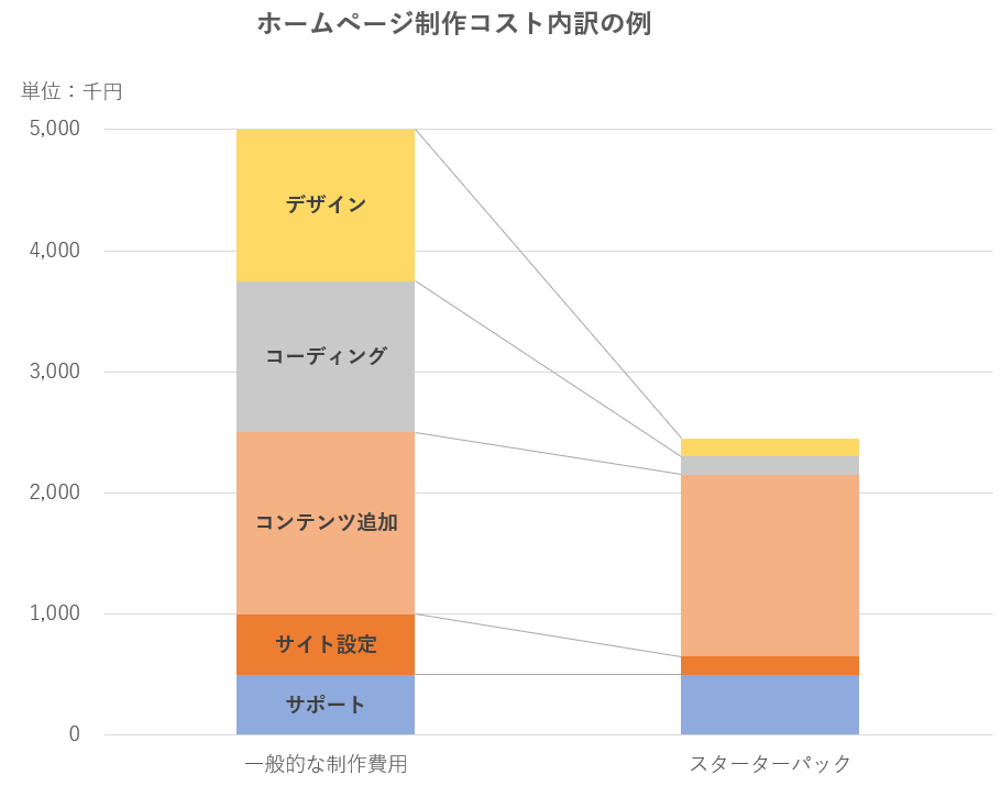 グラフは一般的なホームページ制作費用の例と当サービス(スターターパック)のコスト内訳をわかりやすく比較したものです。